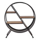 Estantería de madera de mango y acero negro con una puertas de acero negro correderas, espacios para almacenaje y cajones.