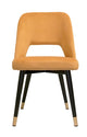 Silla con estructura de acero, tapizada en tela de terciopelo amarillo, con formas ergonómicas y patas negras y capuchón dorado.