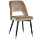 Silla con estructura de acero, tapizada en tela de terciopelo beige, con formas ergonómicas y patas negras y capuchón dorado.
